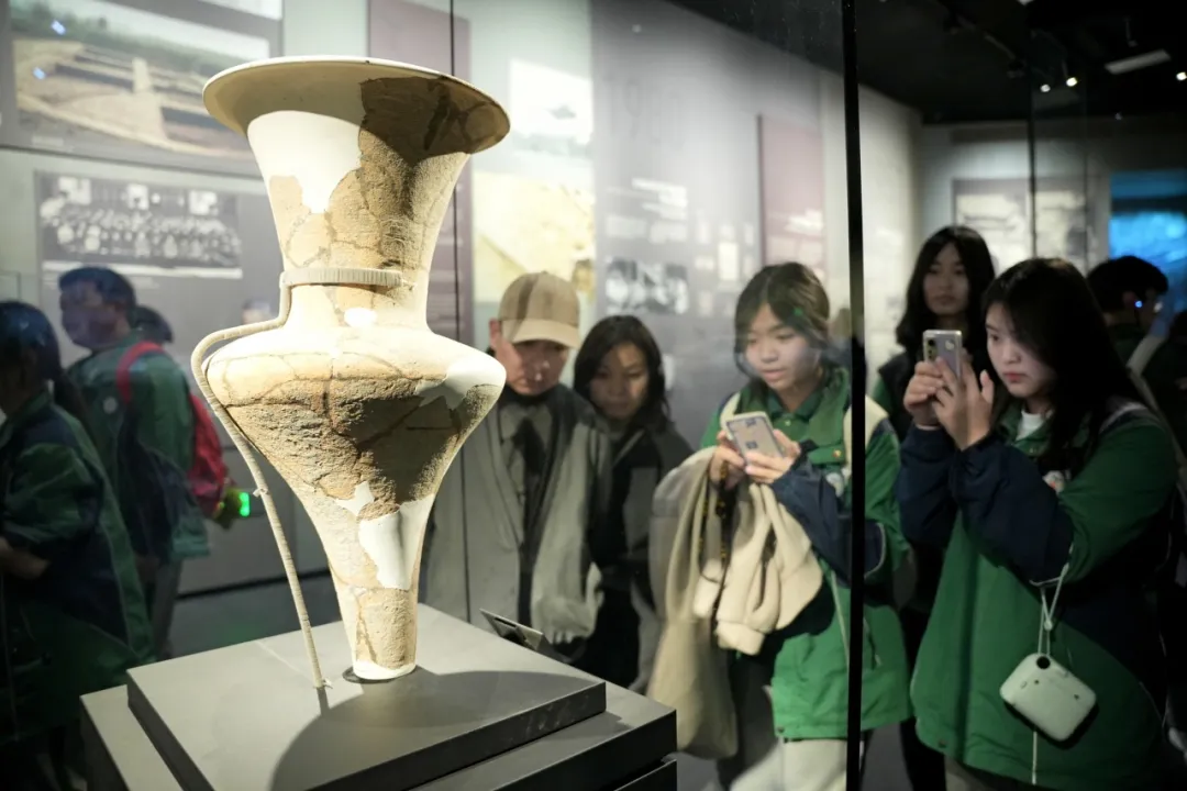 大家透过玻璃罩,从各个角度仔细欣赏,拿出手机或拍照、或录影、或与文物合照。